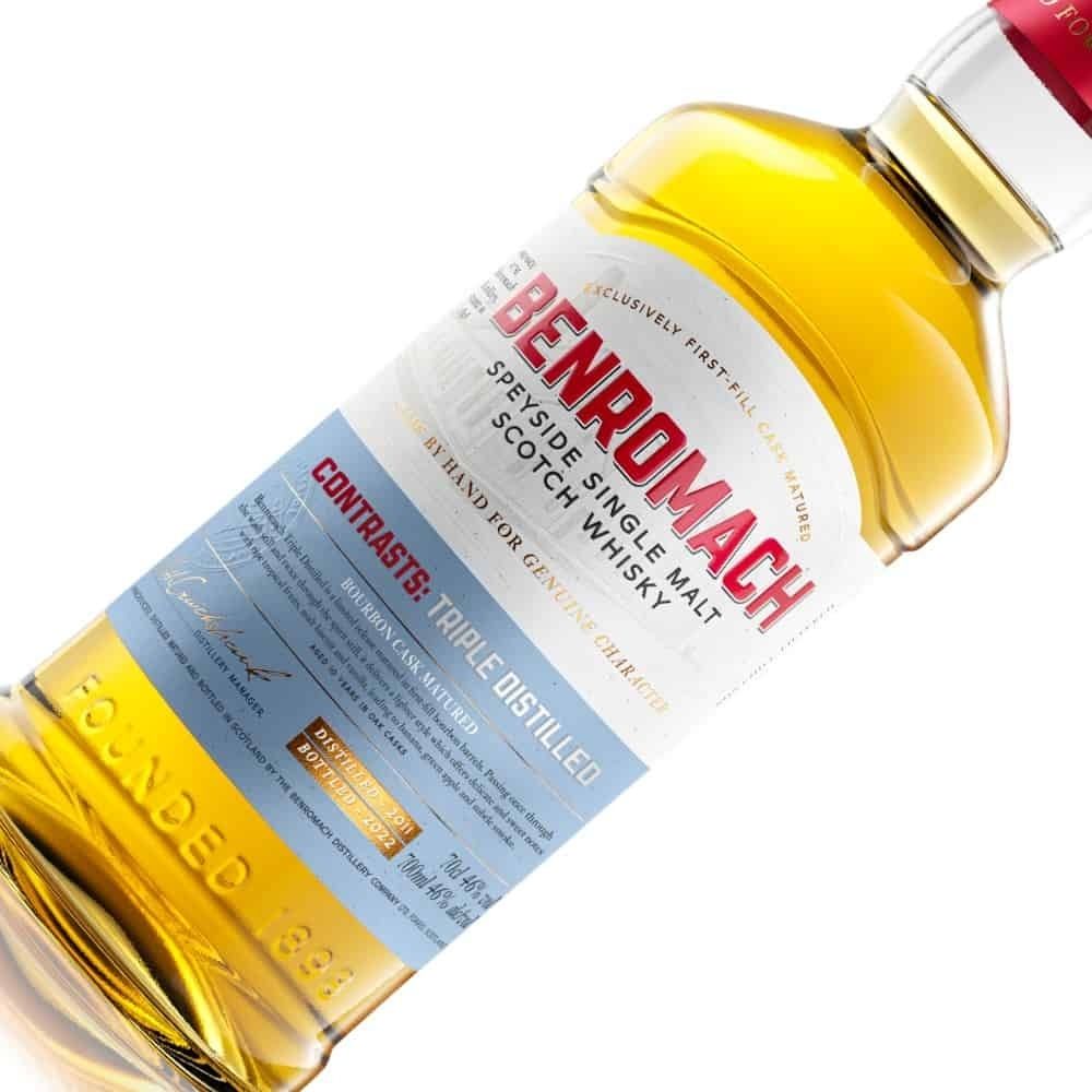 Benromach Triple Distilled es una expresión especial de la destilería Benromach, conocida por su estilo tradicional de Speyside. Este whisky se destila tres veces en lugar del habitual proceso doble, lo que le otorga un carácter más suave y delicado.